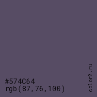 Цвет #574C64 в цветовой модели RGB обозначается тремя октетами (87, 76, 100) в десятичном формате и #574C64 в шестнадцатиричном (hex) формате, которые являются интенсивностью красного 87 (hex 57), интенсивность зелёного 76 (hex 4C) и интенсивность синего 100 (hex 64).