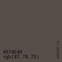 Цвет #574E49 в цветовой модели RGB обозначается тремя октетами (87, 78, 73) в десятичном формате и #574E49 в шестнадцатиричном (hex) формате, которые являются интенсивностью красного 87 (hex 57), интенсивность зелёного 78 (hex 4E) и интенсивность синего 73 (hex 49).