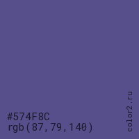 Цвет #574F8C в цветовой модели RGB обозначается тремя октетами (87, 79, 140) в десятичном формате и #574F8C в шестнадцатиричном (hex) формате, которые являются интенсивностью красного 87 (hex 57), интенсивность зелёного 79 (hex 4F) и интенсивность синего 140 (hex 8C).