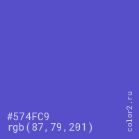 Цвет #574FC9 в цветовой модели RGB обозначается тремя октетами (87, 79, 201) в десятичном формате и #574FC9 в шестнадцатиричном (hex) формате, которые являются интенсивностью красного 87 (hex 57), интенсивность зелёного 79 (hex 4F) и интенсивность синего 201 (hex C9).