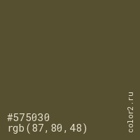 Цвет #575030 в цветовой модели RGB обозначается тремя октетами (87, 80, 48) в десятичном формате и #575030 в шестнадцатиричном (hex) формате, которые являются интенсивностью красного 87 (hex 57), интенсивность зелёного 80 (hex 50) и интенсивность синего 48 (hex 30).