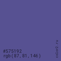 Цвет #575192 в цветовой модели RGB обозначается тремя октетами (87, 81, 146) в десятичном формате и #575192 в шестнадцатиричном (hex) формате, которые являются интенсивностью красного 87 (hex 57), интенсивность зелёного 81 (hex 51) и интенсивность синего 146 (hex 92).