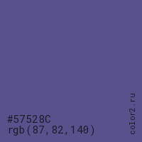 Цвет #57528C в цветовой модели RGB обозначается тремя октетами (87, 82, 140) в десятичном формате и #57528C в шестнадцатиричном (hex) формате, которые являются интенсивностью красного 87 (hex 57), интенсивность зелёного 82 (hex 52) и интенсивность синего 140 (hex 8C).