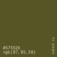 Цвет #575526 в цветовой модели RGB обозначается тремя октетами (87, 85, 38) в десятичном формате и #575526 в шестнадцатиричном (hex) формате, которые являются интенсивностью красного 87 (hex 57), интенсивность зелёного 85 (hex 55) и интенсивность синего 38 (hex 26).