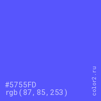 Цвет #5755FD в цветовой модели RGB обозначается тремя октетами (87, 85, 253) в десятичном формате и #5755FD в шестнадцатиричном (hex) формате, которые являются интенсивностью красного 87 (hex 57), интенсивность зелёного 85 (hex 55) и интенсивность синего 253 (hex FD).