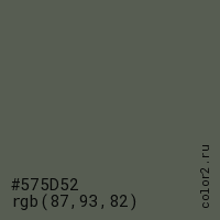 Цвет #575D52 в цветовой модели RGB обозначается тремя октетами (87, 93, 82) в десятичном формате и #575D52 в шестнадцатиричном (hex) формате, которые являются интенсивностью красного 87 (hex 57), интенсивность зелёного 93 (hex 5D) и интенсивность синего 82 (hex 52).