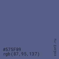 Цвет #575F89 в цветовой модели RGB обозначается тремя октетами (87, 95, 137) в десятичном формате и #575F89 в шестнадцатиричном (hex) формате, которые являются интенсивностью красного 87 (hex 57), интенсивность зелёного 95 (hex 5F) и интенсивность синего 137 (hex 89).
