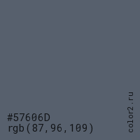 Цвет #57606D в цветовой модели RGB обозначается тремя октетами (87, 96, 109) в десятичном формате и #57606D в шестнадцатиричном (hex) формате, которые являются интенсивностью красного 87 (hex 57), интенсивность зелёного 96 (hex 60) и интенсивность синего 109 (hex 6D).