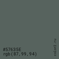 Цвет #57635E в цветовой модели RGB обозначается тремя октетами (87, 99, 94) в десятичном формате и #57635E в шестнадцатиричном (hex) формате, которые являются интенсивностью красного 87 (hex 57), интенсивность зелёного 99 (hex 63) и интенсивность синего 94 (hex 5E).