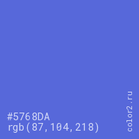 Цвет #5768DA в цветовой модели RGB обозначается тремя октетами (87, 104, 218) в десятичном формате и #5768DA в шестнадцатиричном (hex) формате, которые являются интенсивностью красного 87 (hex 57), интенсивность зелёного 104 (hex 68) и интенсивность синего 218 (hex DA).