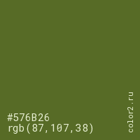 Цвет #576B26 в цветовой модели RGB обозначается тремя октетами (87, 107, 38) в десятичном формате и #576B26 в шестнадцатиричном (hex) формате, которые являются интенсивностью красного 87 (hex 57), интенсивность зелёного 107 (hex 6B) и интенсивность синего 38 (hex 26).