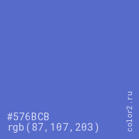 Цвет #576BCB в цветовой модели RGB обозначается тремя октетами (87, 107, 203) в десятичном формате и #576BCB в шестнадцатиричном (hex) формате, которые являются интенсивностью красного 87 (hex 57), интенсивность зелёного 107 (hex 6B) и интенсивность синего 203 (hex CB).