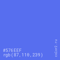 Цвет #576EEF в цветовой модели RGB обозначается тремя октетами (87, 110, 239) в десятичном формате и #576EEF в шестнадцатиричном (hex) формате, которые являются интенсивностью красного 87 (hex 57), интенсивность зелёного 110 (hex 6E) и интенсивность синего 239 (hex EF).