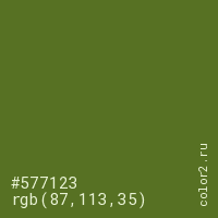 Цвет #577123 в цветовой модели RGB обозначается тремя октетами (87, 113, 35) в десятичном формате и #577123 в шестнадцатиричном (hex) формате, которые являются интенсивностью красного 87 (hex 57), интенсивность зелёного 113 (hex 71) и интенсивность синего 35 (hex 23).