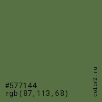 Цвет #577144 в цветовой модели RGB обозначается тремя октетами (87, 113, 68) в десятичном формате и #577144 в шестнадцатиричном (hex) формате, которые являются интенсивностью красного 87 (hex 57), интенсивность зелёного 113 (hex 71) и интенсивность синего 68 (hex 44).