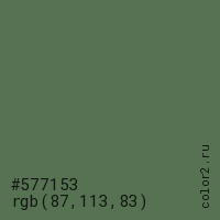 Цвет #577153 в цветовой модели RGB обозначается тремя октетами (87, 113, 83) в десятичном формате и #577153 в шестнадцатиричном (hex) формате, которые являются интенсивностью красного 87 (hex 57), интенсивность зелёного 113 (hex 71) и интенсивность синего 83 (hex 53).