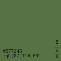 Цвет #577245 в цветовой модели RGB обозначается тремя октетами (87, 114, 69) в десятичном формате и #577245 в шестнадцатиричном (hex) формате, которые являются интенсивностью красного 87 (hex 57), интенсивность зелёного 114 (hex 72) и интенсивность синего 69 (hex 45).
