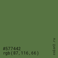 Цвет #577442 в цветовой модели RGB обозначается тремя октетами (87, 116, 66) в десятичном формате и #577442 в шестнадцатиричном (hex) формате, которые являются интенсивностью красного 87 (hex 57), интенсивность зелёного 116 (hex 74) и интенсивность синего 66 (hex 42).