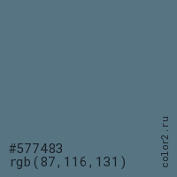 Цвет #577483 в цветовой модели RGB обозначается тремя октетами (87, 116, 131) в десятичном формате и #577483 в шестнадцатиричном (hex) формате, которые являются интенсивностью красного 87 (hex 57), интенсивность зелёного 116 (hex 74) и интенсивность синего 131 (hex 83).