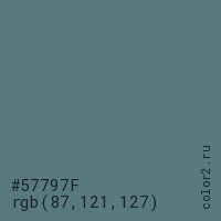 Цвет #57797F в цветовой модели RGB обозначается тремя октетами (87, 121, 127) в десятичном формате и #57797F в шестнадцатиричном (hex) формате, которые являются интенсивностью красного 87 (hex 57), интенсивность зелёного 121 (hex 79) и интенсивность синего 127 (hex 7F).