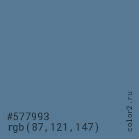 Цвет #577993 в цветовой модели RGB обозначается тремя октетами (87, 121, 147) в десятичном формате и #577993 в шестнадцатиричном (hex) формате, которые являются интенсивностью красного 87 (hex 57), интенсивность зелёного 121 (hex 79) и интенсивность синего 147 (hex 93).