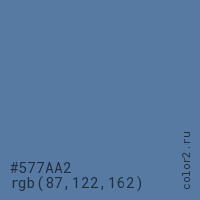 Цвет #577AA2 в цветовой модели RGB обозначается тремя октетами (87, 122, 162) в десятичном формате и #577AA2 в шестнадцатиричном (hex) формате, которые являются интенсивностью красного 87 (hex 57), интенсивность зелёного 122 (hex 7A) и интенсивность синего 162 (hex A2).