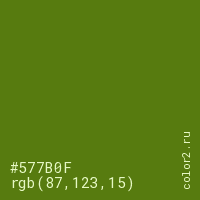 Цвет #577B0F в цветовой модели RGB обозначается тремя октетами (87, 123, 15) в десятичном формате и #577B0F в шестнадцатиричном (hex) формате, которые являются интенсивностью красного 87 (hex 57), интенсивность зелёного 123 (hex 7B) и интенсивность синего 15 (hex 0F).