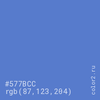 Цвет #577BCC в цветовой модели RGB обозначается тремя октетами (87, 123, 204) в десятичном формате и #577BCC в шестнадцатиричном (hex) формате, которые являются интенсивностью красного 87 (hex 57), интенсивность зелёного 123 (hex 7B) и интенсивность синего 204 (hex CC).