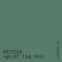 Цвет #577C69 в цветовой модели RGB обозначается тремя октетами (87, 124, 105) в десятичном формате и #577C69 в шестнадцатиричном (hex) формате, которые являются интенсивностью красного 87 (hex 57), интенсивность зелёного 124 (hex 7C) и интенсивность синего 105 (hex 69).