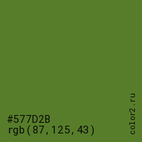 Цвет #577D2B в цветовой модели RGB обозначается тремя октетами (87, 125, 43) в десятичном формате и #577D2B в шестнадцатиричном (hex) формате, которые являются интенсивностью красного 87 (hex 57), интенсивность зелёного 125 (hex 7D) и интенсивность синего 43 (hex 2B).