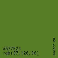 Цвет #577E24 в цветовой модели RGB обозначается тремя октетами (87, 126, 36) в десятичном формате и #577E24 в шестнадцатиричном (hex) формате, которые являются интенсивностью красного 87 (hex 57), интенсивность зелёного 126 (hex 7E) и интенсивность синего 36 (hex 24).