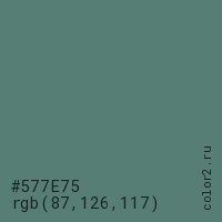 Цвет #577E75 в цветовой модели RGB обозначается тремя октетами (87, 126, 117) в десятичном формате и #577E75 в шестнадцатиричном (hex) формате, которые являются интенсивностью красного 87 (hex 57), интенсивность зелёного 126 (hex 7E) и интенсивность синего 117 (hex 75).