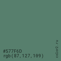 Цвет #577F6D в цветовой модели RGB обозначается тремя октетами (87, 127, 109) в десятичном формате и #577F6D в шестнадцатиричном (hex) формате, которые являются интенсивностью красного 87 (hex 57), интенсивность зелёного 127 (hex 7F) и интенсивность синего 109 (hex 6D).