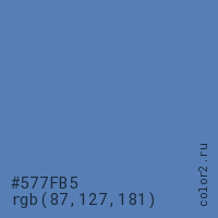 Цвет #577FB5 в цветовой модели RGB обозначается тремя октетами (87, 127, 181) в десятичном формате и #577FB5 в шестнадцатиричном (hex) формате, которые являются интенсивностью красного 87 (hex 57), интенсивность зелёного 127 (hex 7F) и интенсивность синего 181 (hex B5).
