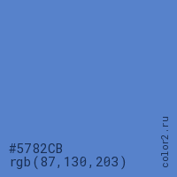 Цвет #5782CB в цветовой модели RGB обозначается тремя октетами (87, 130, 203) в десятичном формате и #5782CB в шестнадцатиричном (hex) формате, которые являются интенсивностью красного 87 (hex 57), интенсивность зелёного 130 (hex 82) и интенсивность синего 203 (hex CB).