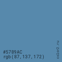 Цвет #5789AC в цветовой модели RGB обозначается тремя октетами (87, 137, 172) в десятичном формате и #5789AC в шестнадцатиричном (hex) формате, которые являются интенсивностью красного 87 (hex 57), интенсивность зелёного 137 (hex 89) и интенсивность синего 172 (hex AC).
