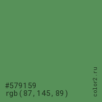 Цвет #579159 в цветовой модели RGB обозначается тремя октетами (87, 145, 89) в десятичном формате и #579159 в шестнадцатиричном (hex) формате, которые являются интенсивностью красного 87 (hex 57), интенсивность зелёного 145 (hex 91) и интенсивность синего 89 (hex 59).