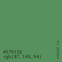 Цвет #57915E в цветовой модели RGB обозначается тремя октетами (87, 145, 94) в десятичном формате и #57915E в шестнадцатиричном (hex) формате, которые являются интенсивностью красного 87 (hex 57), интенсивность зелёного 145 (hex 91) и интенсивность синего 94 (hex 5E).