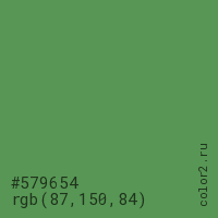 Цвет #579654 в цветовой модели RGB обозначается тремя октетами (87, 150, 84) в десятичном формате и #579654 в шестнадцатиричном (hex) формате, которые являются интенсивностью красного 87 (hex 57), интенсивность зелёного 150 (hex 96) и интенсивность синего 84 (hex 54).