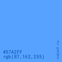 Цвет #57A2FF в цветовой модели RGB обозначается тремя октетами (87, 162, 255) в десятичном формате и #57A2FF в шестнадцатиричном (hex) формате, которые являются интенсивностью красного 87 (hex 57), интенсивность зелёного 162 (hex A2) и интенсивность синего 255 (hex FF).