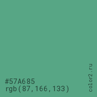 Цвет #57A685 в цветовой модели RGB обозначается тремя октетами (87, 166, 133) в десятичном формате и #57A685 в шестнадцатиричном (hex) формате, которые являются интенсивностью красного 87 (hex 57), интенсивность зелёного 166 (hex A6) и интенсивность синего 133 (hex 85).