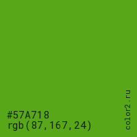 Цвет #57A718 в цветовой модели RGB обозначается тремя октетами (87, 167, 24) в десятичном формате и #57A718 в шестнадцатиричном (hex) формате, которые являются интенсивностью красного 87 (hex 57), интенсивность зелёного 167 (hex A7) и интенсивность синего 24 (hex 18).