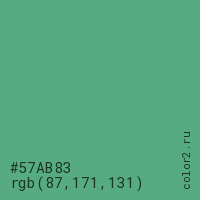 Цвет #57AB83 в цветовой модели RGB обозначается тремя октетами (87, 171, 131) в десятичном формате и #57AB83 в шестнадцатиричном (hex) формате, которые являются интенсивностью красного 87 (hex 57), интенсивность зелёного 171 (hex AB) и интенсивность синего 131 (hex 83).