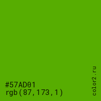 Цвет #57AD01 в цветовой модели RGB обозначается тремя октетами (87, 173, 1) в десятичном формате и #57AD01 в шестнадцатиричном (hex) формате, которые являются интенсивностью красного 87 (hex 57), интенсивность зелёного 173 (hex AD) и интенсивность синего 1 (hex 01).