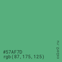 Цвет #57AF7D в цветовой модели RGB обозначается тремя октетами (87, 175, 125) в десятичном формате и #57AF7D в шестнадцатиричном (hex) формате, которые являются интенсивностью красного 87 (hex 57), интенсивность зелёного 175 (hex AF) и интенсивность синего 125 (hex 7D).