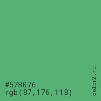 Цвет #57B076 в цветовой модели RGB обозначается тремя октетами (87, 176, 118) в десятичном формате и #57B076 в шестнадцатиричном (hex) формате, которые являются интенсивностью красного 87 (hex 57), интенсивность зелёного 176 (hex B0) и интенсивность синего 118 (hex 76).
