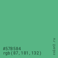Цвет #57B584 в цветовой модели RGB обозначается тремя октетами (87, 181, 132) в десятичном формате и #57B584 в шестнадцатиричном (hex) формате, которые являются интенсивностью красного 87 (hex 57), интенсивность зелёного 181 (hex B5) и интенсивность синего 132 (hex 84).