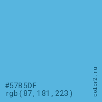 Цвет #57B5DF в цветовой модели RGB обозначается тремя октетами (87, 181, 223) в десятичном формате и #57B5DF в шестнадцатиричном (hex) формате, которые являются интенсивностью красного 87 (hex 57), интенсивность зелёного 181 (hex B5) и интенсивность синего 223 (hex DF).