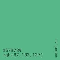 Цвет #57B789 в цветовой модели RGB обозначается тремя октетами (87, 183, 137) в десятичном формате и #57B789 в шестнадцатиричном (hex) формате, которые являются интенсивностью красного 87 (hex 57), интенсивность зелёного 183 (hex B7) и интенсивность синего 137 (hex 89).