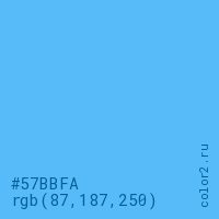 Цвет #57BBFA в цветовой модели RGB обозначается тремя октетами (87, 187, 250) в десятичном формате и #57BBFA в шестнадцатиричном (hex) формате, которые являются интенсивностью красного 87 (hex 57), интенсивность зелёного 187 (hex BB) и интенсивность синего 250 (hex FA).